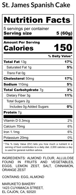 MaruketoST. JAMES SPANISH CAKE$13.95 INGREDIENTS: BLANCHED ALMOND FLOUR, EGGS, NON-GMO ALLULOSE, SALT, CINNAMON, LEMON ZEST, ORANGE ZEST. CONTAINS: EGG, ALMOND Quantity Add to cart Related products MaruketoKETO CHEESECAKE $29.50 Add to cart MaruketoKETO DINNER ROLLS $15.95 Add to cart MaruketoHAMBURGER BUNS $15.95 Add to cart